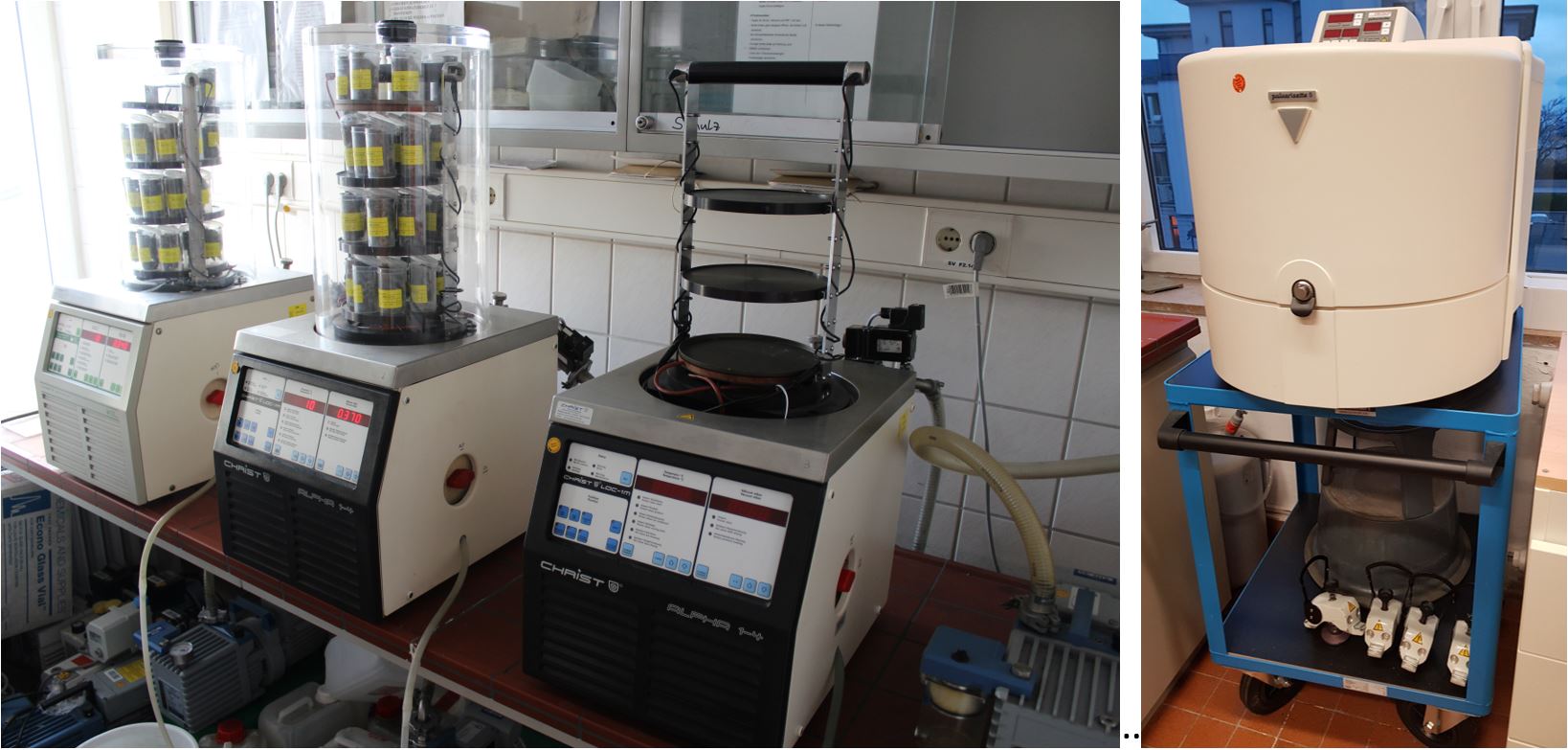Before in-depth geochemical analyses our sediment samples are typically freeze-dried and grinded. Several freeze-drying systems (Christ) and one ball mill (Fritsch) are ensuring the processing of large sample amounts.