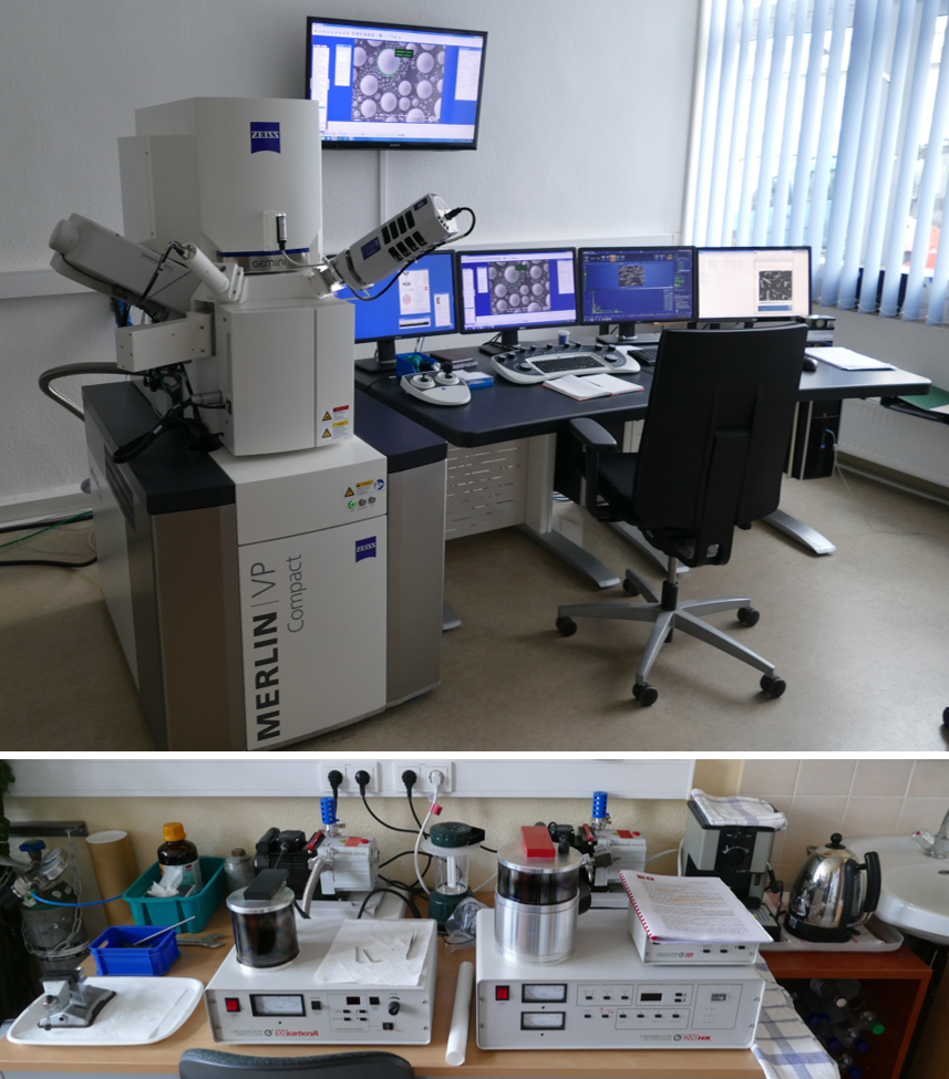In this lab we have a Merlin-Compact VP microscope from Zeiss, coupled with an EDX from Oxford-Instruments. The microscope has several detectors (SE, BSE, In-Lens) for preparing high-quality pictures from the objects. The EDX-technique including the comfortable software Inca and Aztec allows the analysis of major- and minor elements in very small sample volumes (below 1 µm3). In our lab we analyses various sample materials from rocks, sediments, suspended matter, biological objects including micro-organisms.