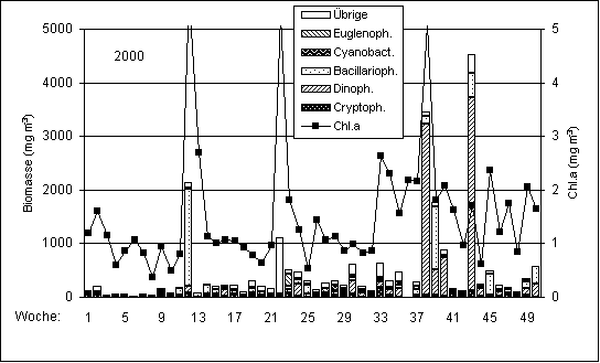 Die Probe vom 5.9.2000 (= 36.Woche) war wegen ihres hohen Sedimentanteils nicht auswertbar. Die am 19.9.2000 (= 38.Woche) beobachtete Blüte von Ceratium tripos (3072 mg m-3) war bereits zum 29.9.2000 stark zurückgegangen (Biomasse von Ceratium tripos: 432 mg m-3). Aber es kam zum 29.9. noch einmal die im Sommer typische Kieselalge Dactyliosolen fragilissimus mit einer Biomasse von 1033 mg m-3 kurzzeitig zur Entwicklung. Im Oktober nahm die Phytoplankton-Biomasse aber wieder stark ab. Am 1. November zeigte sich abermals ein Maximum, welches wieder von Ceratium tripos (2518 mg m-3), Ceratium fusus (840 mg m-3) und Dactyliosolen fragilissimus (165 mg m-3) gebildet wurde. In der Chlorophyll a - Konzentration trat ein Maximum am 14.11.2000 auf, das sich nicht in dem Maße in der mikroskopisch bestimmten Phytoplankton-Biomasse zeigte. Es wurde von Coscinodiscus-Arten (378 mg m-3, meistens C. granii) gebildet. Nach einem Biomasse-Minimum am 5.12.2000 kam es zum Jahresende wiederum zu einem Anstieg der Phytoplankton-Biomasse, hauptsächlich durch Wachstum von Kieselalgen (Pseudonitzschia cf. pungens, Chaetoceros curvisetum) und Dinoflagellaten (Ceratium tripos).