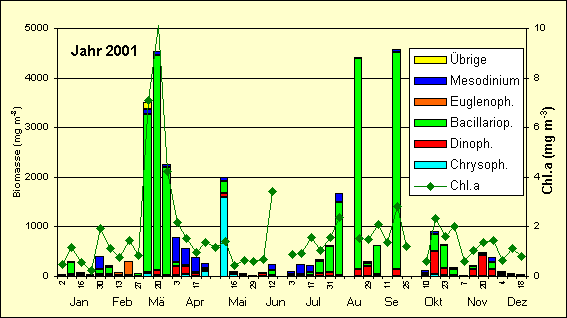 Im Winter sind die Phytoplanktonbiomassen gering. Die erhöhte Biomasse am 9.1.01 ist zufällig bedingt durch den Fund eines sehr großen Exemplars der Kieselalge Attheya decora. Daneben war der Dinoflagellat Heterocapsa rotundatarelativ häufig. Zum 30.1.2001 scheint aber ein reales Wachstum einzusetzen, insbesondere durch den phototrophen Ciliaten Mesodinium rubrum (Synonym: Myrionecta rubra), aber auch durch die Cryptophyceae Teleaulax sp. und die Kieselalgen (Bacillariophyceae) Chaetoceros decipiens, Ch. curvisetus und Rhizosolenia setigera. Chaetoceros curvisetus und Proboscia alata wuchsen Anfang Februar noch weiter an, während ab Mitte Februar die Euglenophyceae Euteptiella sp. zur Entwicklung kam. Es muß dabei berücksichtigt werden, dass die Werte vom 13.2. bis 27.2.2001 noch deutlich unterschätzt sein könnten, da ein hoher Anteil an Sedimentpartikeln die mikroskopische Zählung der Proben behinderte und damit ungenau machte. Danach fiel eine Probennahme aus. Die Arbeiten wurden am 14.3.2001 in Kühlungsborn fortgesetzt. Zu dem Zeitpunkt hatte sich bereits eine starke Blüte der Kieselalgen-Gattung Chaetoceros (Ch. diadema, Ch.decipiens, Ch. wighamii) sowie der Kieselalgen Skeletonema costatum und Rhizosolenia setigera entwickelt. Diese Blüte erreichte am 20.3.2001 mit einer Gesamt-Biomasse von 4562 mg m-3 ihr Maximum. Die größte Biomasse machten ungestimmte Chaetoceros-Arten mit 2530 mg m-3 aus. Daneben kamen die Kieselalgen Ch. curvisetus (246 mg m-3), Ch. diadema (136 mg m-3), Thalassiosira spp. (809 mg m-3 ) und Rhizosolenia setigera (333 mg m-3) vor. Zum 27.3. nahmen die Chaetoceros-Arten stark ab (Chaetoceros spp.= 369 mg m-3 , Ch. curvisetus = 103 mg m-3), während Thalassiosira spp. (= 1360 mg m-3 ) und Proboscia alata (176 mg m-3) zunahmen. Bemerkenswert ist die gute Korrelation der Phytoplankton-Frischmasse zu den Chlorophyll a-Konzentrationen. Am 3.4.01 war die Kieselalgenblüte vorüber. Es dominierte jetzt der photoautotrophe Ciliat Mesodinium rubrum (510 mg m-3); daneben traten Dinoflagellaten auf (Gymnodinium spp. 73 mg m-3, 29 mg m-3). Diese Situation blieb im wesentlichen den April über erhalten, bei langsam weiter abnehmenden Biomassen.