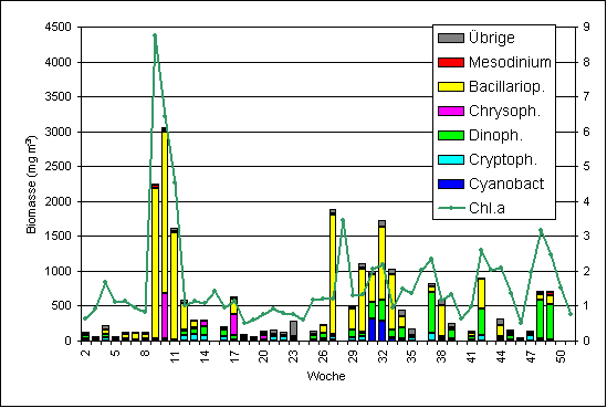 In einer sonnigen Periode entwickelten sich die Kieselalgen zum 26.2.03 (= 9.Woche) explosionsartig (Skeletonema costatum = 1662 mg m-3). Das ist ein sehr früher Blütenzeitpunkt. Die mikroskopischen Phytoplanktonzählungen werden durch die parallel gemessenen Chlorophyll-a-Konzentrationen gestützt. Zum Höhepunkt der Blüte am 4.3.03 trat spontan auch die nackte Form der Chrysophycee Dictyocha speculum mit 648 mg m-3 auf. Die Wassertemperatur war immer noch nicht über 1 °C gestiegen. Erst in der 12. Woche (18.3.03), als die Blüte bereits beendet war, stieg die Temperatur auf 3 °C.