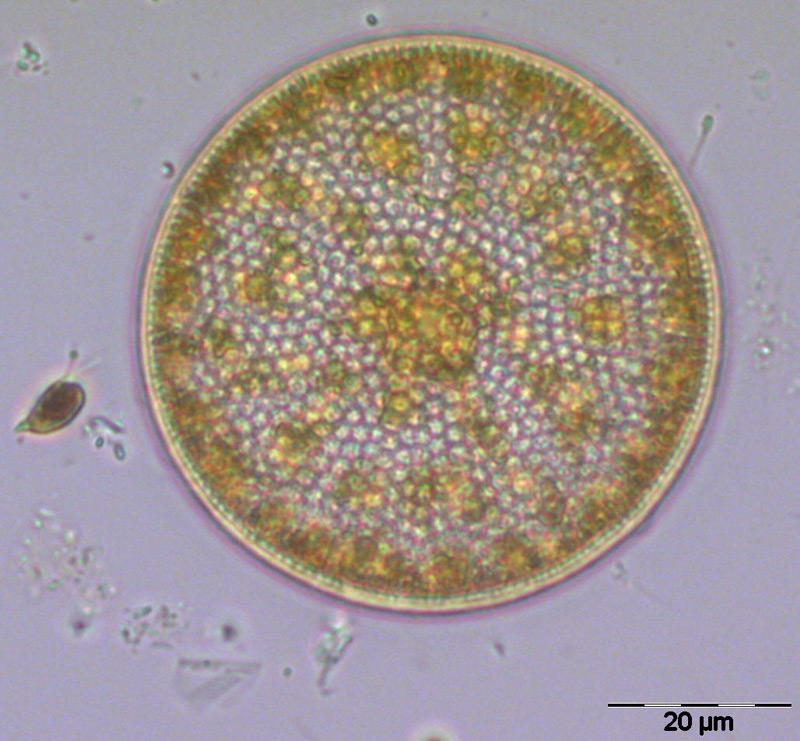 Ungewöhnlich ist das kurzzeitige Erscheinen der großen Kieselalge Coscinodiscus radiatus (Bild 4) mit 82 mg m-3 am 15.5.2012 (Woche 20). In den folgenden Wochen blieb die Biomasse relativ gering, aber die Diversität war recht hoch. Am 12.6.2012 (Woche 24) dominierte Melosira moniliformis (Bild 5) neben Dactyliosolen fragilissimus, Heterocapsa rotundata und Plagioselmis prolonga, und es begann die Entwicklung von Ceratium tripos. Am 19.6.2012 trat wiederum Mesodinium rubrum stark auf, daneben aber auch heterotrophe Ciliaten (Strombidium u.a.). An diesem Tag erschienen die stickstoff-fixierenden Cyanobakterien Anabaena spp.und Aphanizomenon sp., die neben den koloniebildenden Cyanobakterien, wie Aphanocapsa spp. und Snowella spp. dann bis in den Herbst präsent bleiben. Ab dem 10.7.2012 kam Nodularia spumigena (Bild 6) hinzu und entwickelten bis zum 17.7.2012 (Woche 29) schnell eine Biomasse von 134 mg m-3, verschwand vorübergehend wieder, erschien am 7.8.2012 mit 61 mg m-3 und blieb mit reduzierten Biomassen bis Ende September präsent.