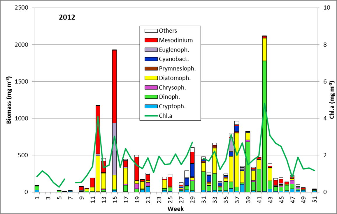 Die im September 2011 beobachtete starke Blüte von Pseudosolenia calcar-avis wiederholte sich im Jahre 2012 nicht; diese Art wurde im Jahre 2010 erstmals von uns beobachtet. Auch die in manchen Jahren gefundene Blüte von Coscinodiscus granii trat nicht auf. Diese Art machte an ihrem Maximum an 23.10.2012 (Woche 43) nur 66 mg m-3 aus. Ab dem 30.10.2012 (Woche 44) sind die Biomassen sehr gering und von Ceratium tripos und Mesodinium rubrum, zeitweise auch von Dictyocha speculum dominiert.
