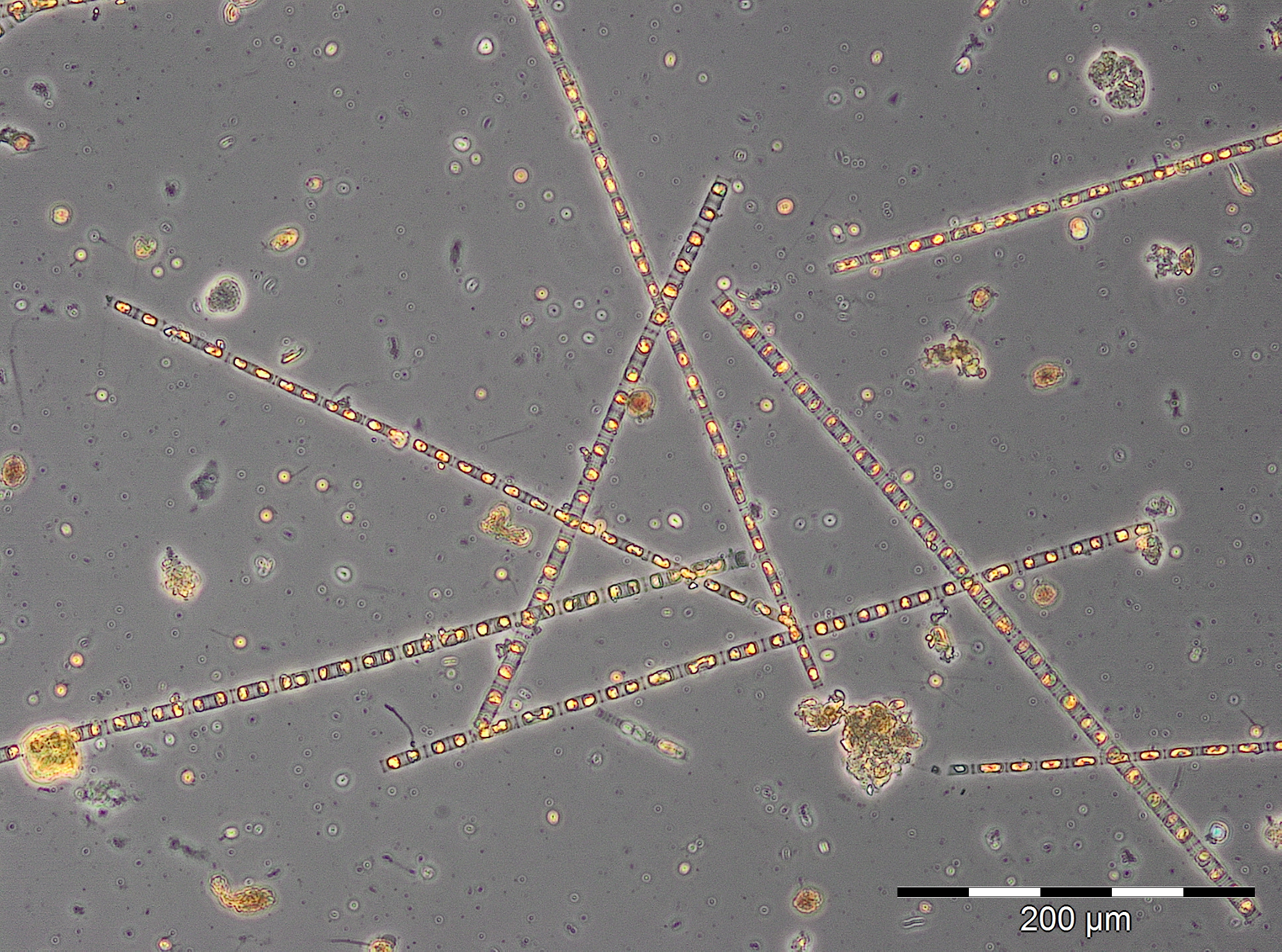 Die Phytoplanktonbiomasse war im Januar naturgemäß gering. Schon während des Temperaturminimums von 2.2°C am 3.2.2015 (Woche 5) begann die Entwicklung von Mesodinium rubrum, Kieselalgen (Diatomophyceae, insbesondere Skeletonema marinoi) und Dictyochophyceen (Dictyocha speculum, Verrucophora farcimen; hier als „Chrysophyceen“ dargestellt). Im Gegensatz zum Vorjahr trat Ceratium tripos zu dieser Zeit nicht mehr auf. Zum 24.2.2015 (Woche 8) ist eine typische Blüte aus Skeletonema marinoi (1926 mg/m³, Bild 1), begleitet von Dictyocha speculum, gewachsen, die sich auch schön in den Chlorophyll-a-Konzentrationen abbildet.