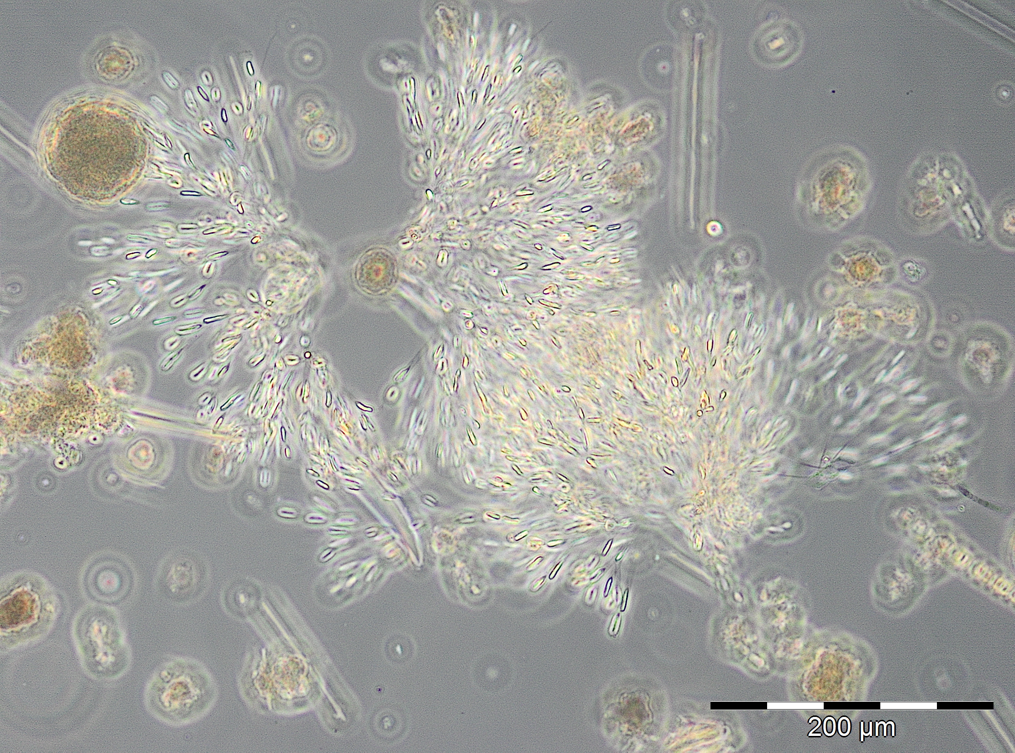 Zum 15.9.2015 (Woche 37) hatte sich eine Blüte der Kieselalgen Pseudosolenia calcar-avis (Bild 6; 863 mg/m³), Cerataulina pelagica (149 mg/m³), Dactyliosolen fragilissimus (55 mg/m³) und Coscinodiscus granii (23 mg/m³) gebildet. Der Anteil der beiden letzteren stieg zum nächsten Messtermin stark an. Es erschienen verschiedene Kieselalgenarten, z.B. erstaunlicherweise die typische Frühjahrsart Skeletonema marinoi vom 20.10.-3.11.2015 mit Biomassen bis 80 mg/m³. Später wurden bedeutend: Rhizosolenia setigera (226 mg/m³) und Guinardia delicatula (79 mg/m³) am 3.11.2015 (Woche 44) sowie Actinocyclus sp. (858 mg/m³) am 17.11.2015 (Woche 46). Interessante Arten waren auch Polykrikos schwartzii (76 mg/m³) und Laboea strobila (76 mg/m³) am 27.10.2015 sowie Heterosigma akashiwo (74 mg/m³) am 17.11.2015.
