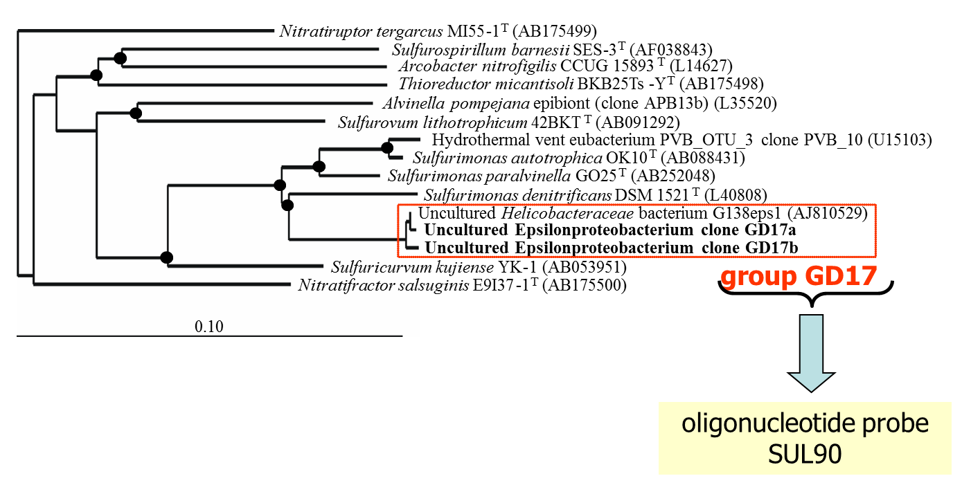 Figure 3. Unrooted tree showing relationships of subgroup GD17 and its closest phylogenetic relatives within the Epsilonproteobacteria. The framed area denotes subgroup GD17 originating from the central Baltic Sea as the target sequence of gene probe SUL90 (modified from Grote et al., 2007).