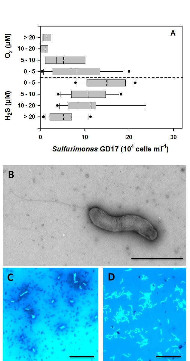 Figure 7: Sulfurimonas GD17 in Baltic Sea redoxclines (from Grote et al. 2012). A. Abundance of the Sulfurimonassubgroup GD17 as determined by CARD-FISH versus grouped concentrations of sulfide and oxygen in Baltic Sea redoxcline samples. Values for sulfide are expressed as negative oxygen concentrations. Box-and-whisker plots with outliers include median (solid) and mean (dashed) values within the boxes. Data from 89 samples collected from redoxclines in the central Baltic Sea during cruises between 2003 and 2009, including 35 data points from refs. (17, 20), is displayed. B. Electron micrograph of a phosphotungstic acid (PTA) negatively stained ´Sulfurimonas gotlandica´ str. GD1 cell cultivated on nitrate and thiosulfate demonstrating spirilla-like morphology and monopolar flagella. Bar - 2 µm. C. Fluorescence microscopy of DAPI-stained ´Sulfurimonas gotlandica´ str. GD1 cells grown on 14C-bicarbonate, followed by microautoradiographic incubation (17). Silver granules surrounding GD1 cells indicate 14C-bicarbonate, suggesting chemolithoautotrophic activity. D. Fluorescence microscopy of DAPI-stained ´Sulfurimonas gotlandica´ str. GD1 cells. Bar - 10 µm.