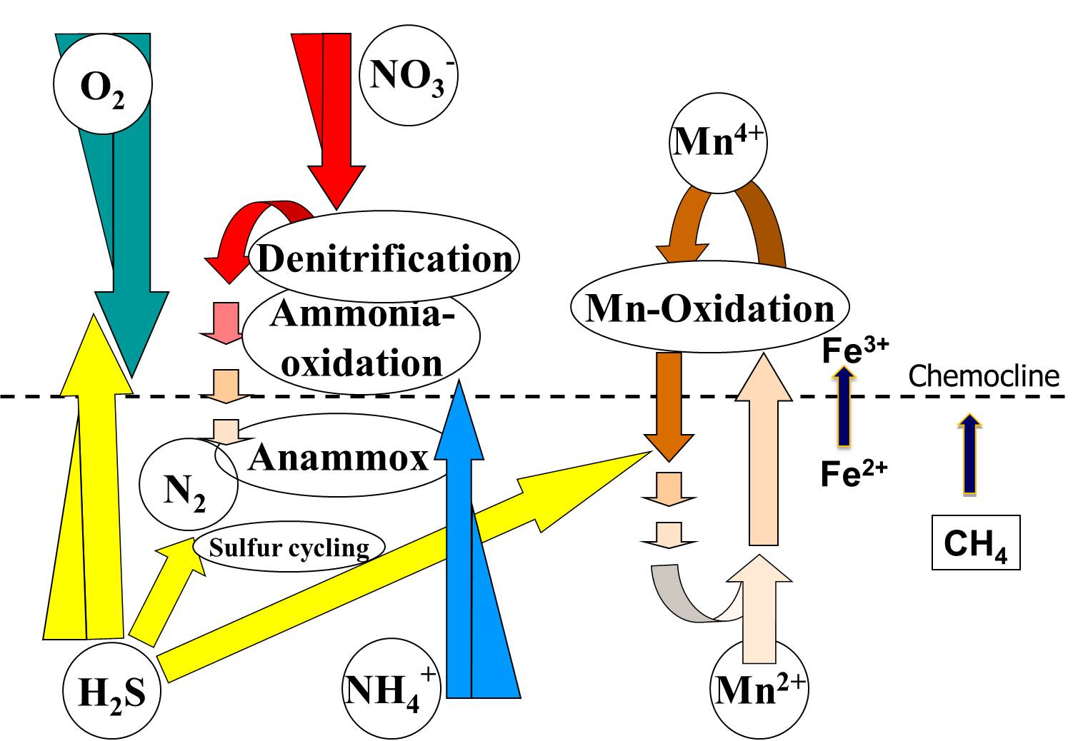 Oxygen-deficient (hypoxic) conditions within a water column can be found in a variety of marine systems. Typically they occur in coastal and marginal seas with permanent or temporal stratification or in the oxygen minimum zones near upwelling areas. Most prominent pelagic systems with anoxic conditions are the Black Sea, the Baltic Sea deeps, and the Cariaco Basin. In the world’s two largest brackish systems, the Black Sea and the Baltic Sea, stratification is due to freshwater input and the establishment of a halocline, which prevents mixing of upper oxygenated and deeper anoxic and sulfidic waters, leading to an intermediate layer with strong vertical redox gradients: the redoxcline. The redox gradient describes the vertical segregation of major electron acceptors and reduced products. It separates the upper oxygenated from anoxic bottom water and is, for this reason, an area of elementary biogeochemical transformations. In aquatic environments it is commonly referred to as the `pelagic redoxcline´ (to distinguish from sedimentary redoxclines) whereas the depth of the oxic-anoxic interface or of the first appearance of sulfide is usually defined as `chemocline´.