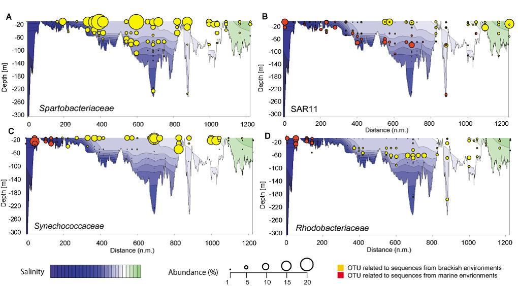 Figure 2: Spatial distribution and abundance of operational taxonomic units (OTU) along a Baltic Sea transect extending east of Gotland and into the Bay of Bothnia. (A) Two dimensional plot of the most abundant OTU in our study, which is related to Spartobacteriaceae. Populational shifts from marine to freshwater populations along the salinity gradient of the Baltic Sea of SAR11 (B), Synechococcaceae (C), Rhodobacteriaceae (D). Modified from Herlemann et al. (2011).
