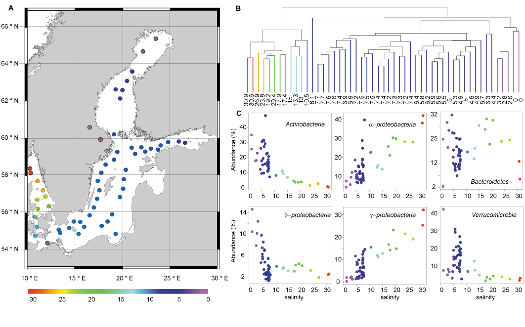 Figure 1: Bacterial communities of surface samples along the Baltic Sea salinity gradient. (A) Map of the Baltic Sea, where each dot represents a sampling station colour-coded according to salinity. (B) Hierarchical clustering of the surface water samples based on bacterial community composition similarity, colour coded according to salinity. The samples cluster in three salinity ranges: freshwater 0–3.2 (purple), brackish 4.6–7.7 (blue), and marine-brackish 10.5–30.9 (other colours). The samples having a salinity of 6.3 and 4.4 were sampled outside Stockholm and St. Petersburg, respectively, the two largest cities in the region, and may potentially be influenced by anthropogenic emissions of nutrients and/or pollutants. (C) Relative abundance vs. salinity for abundant phyla and proteobacterial classes colour coded according to salinity. Modified from Herlemann et al. (2011).