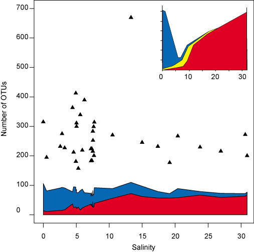 Figure 3. Comparison of the sequences of operational taxonomic units (OTUs) from surface water in our study to environmental sequences from freshwater and marine reference environments outside of the Baltic Sea. Blue and red areas indicate the Number of OTUs ≥ 97% identical to freshwater (blue) and marine (red) sequences, respectively. Black triangles are estimated number of OTUs based on the CHAO1 richness estimator. Inset: The Remane curve (reconstructed from Remane, 1934) showing benthic fauna richness along a Baltic Sea salinity gradient. Blue, number of freshwater species; red, number of marine species; and yellow, number of brackish specialist species.