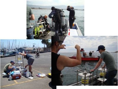 Field work at the Coal Oil Point seep field in Santa Barbara (CA). Top: preparation for diving at the seep site. Left: meeting of the two research vessels at the Rostocker Seep site. Right: subsampling of bubble catcher at Santa Barbara harbor.