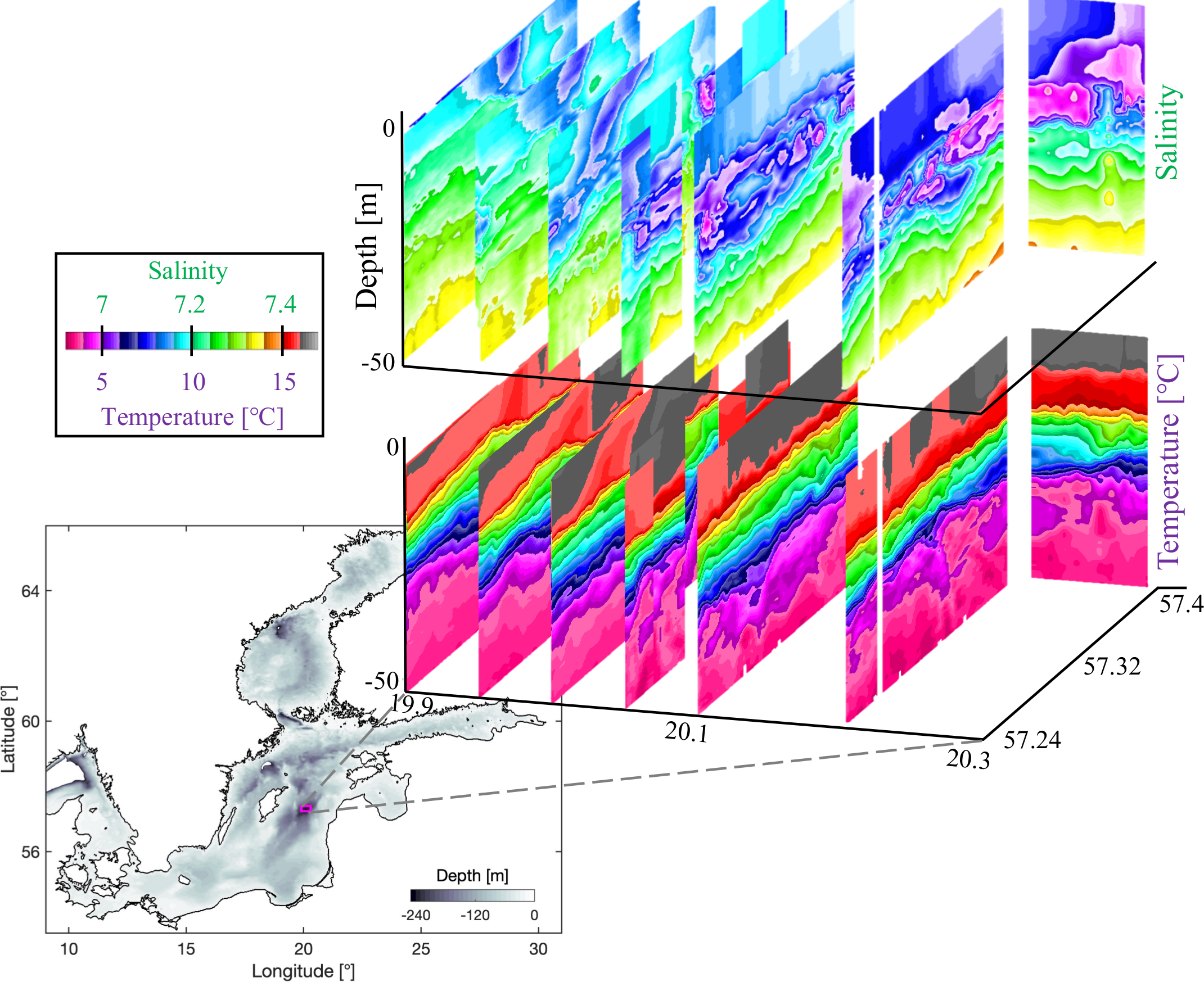 Using the Baltic Sea as a natural laboratory, with high-resolution observational and numerical approaches we study the SBL dynamics at relatively small spatial and temporal scales; down to horizontal scales of 1-10 km and time scales of hours to days i.e., submesoscales. Submesoscales are abundant in the SBL in the form of vortices, fronts and, filaments, with an ability to change the upper ocean stratification, affect vertical transport, and induce a downscale cascade of energy towards dissipation. Our group focuses on understanding the interplay of physical processes in the SBL such as salinity inversions, subduction, a relatively new class of turbulent motion abundant in the SBL i.e., submesoscale turbulence, under varying climate forcing. This research is part of the project Energy transfers in Atmosphere and Ocean (TRR181). Our working group is in close collaboration with the group of turbulence and small-scale processes.