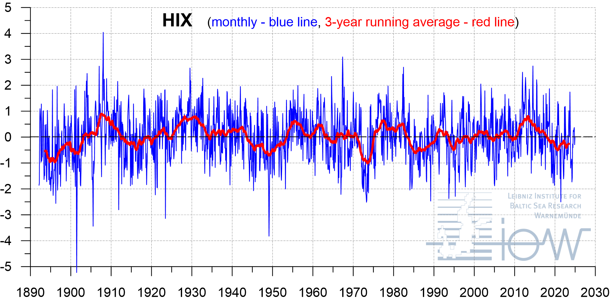 Climatology of the St. Helena Island Climate Index from 1892 to 2024. The monthly values of the HIX are shown in blue. The red curve shows the moving average of the HIX over 3 years.
