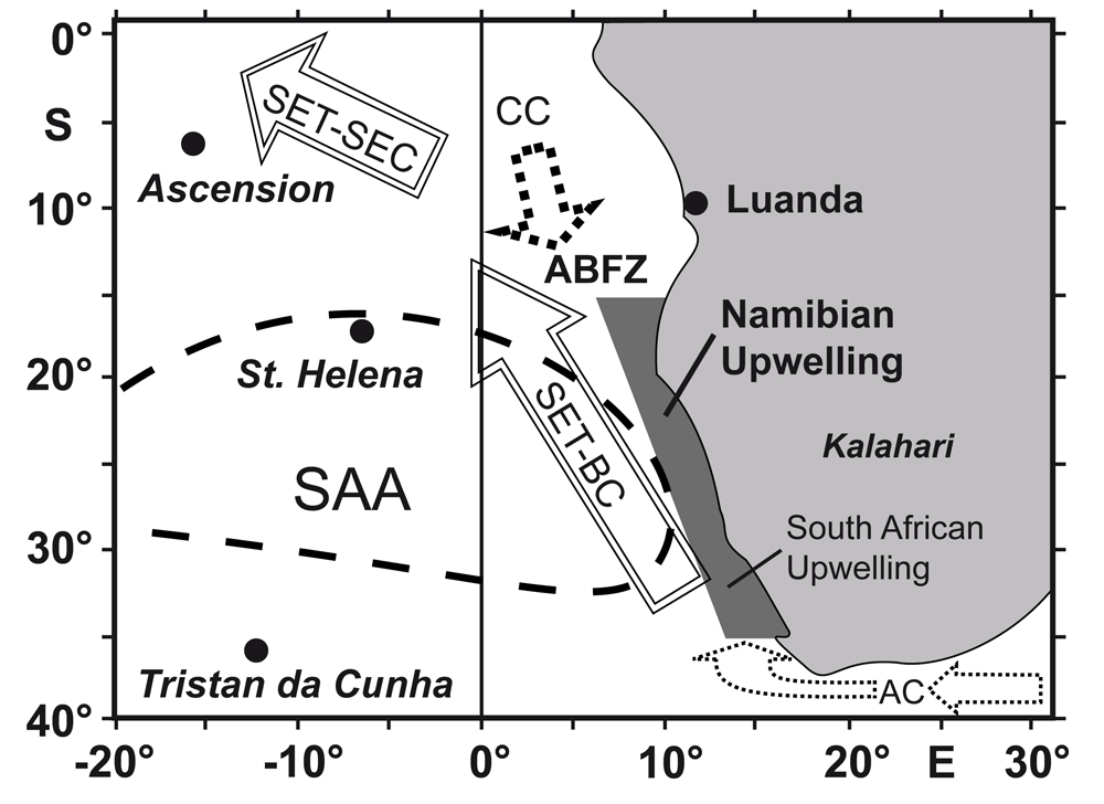 The Benguela upwelling system in the subtropical southeast Atlantic is subject to dramatic interannual fluctuations sometimes termed ‘Benguela Niño’ events. The South Atlantic Anticyclone (SAA) is assumed to be the responsible climatic ‘activity centre’ for the south-east trade winds driving the upwelling processes along the Namibian and South-west African coasts.