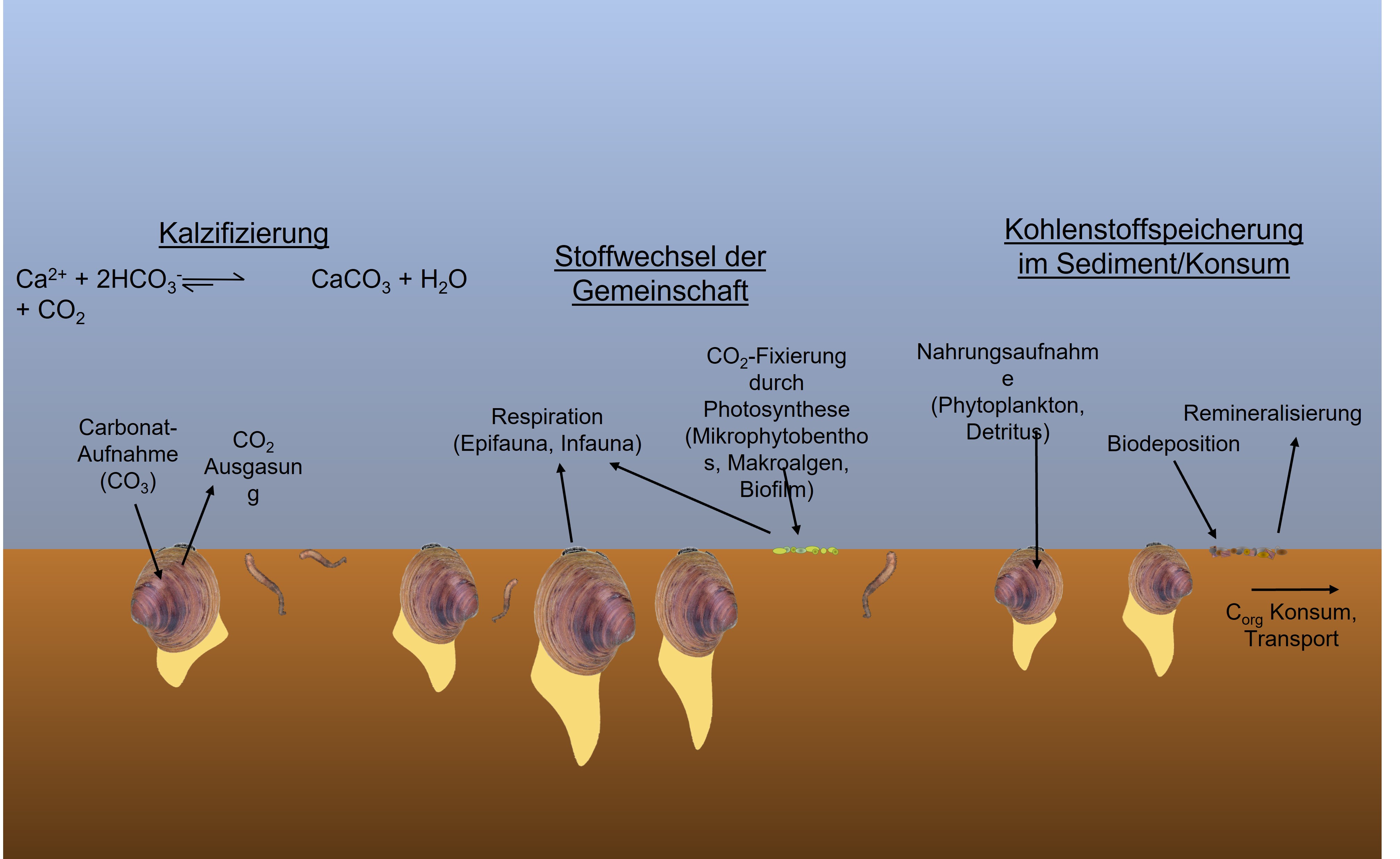 Schematische Darstellung der verschiedenen Prozesse im Kohlenstoffbudget der Arctica islandica-Gemeinschaft, abgeleitet aus Sea et al. (2022)