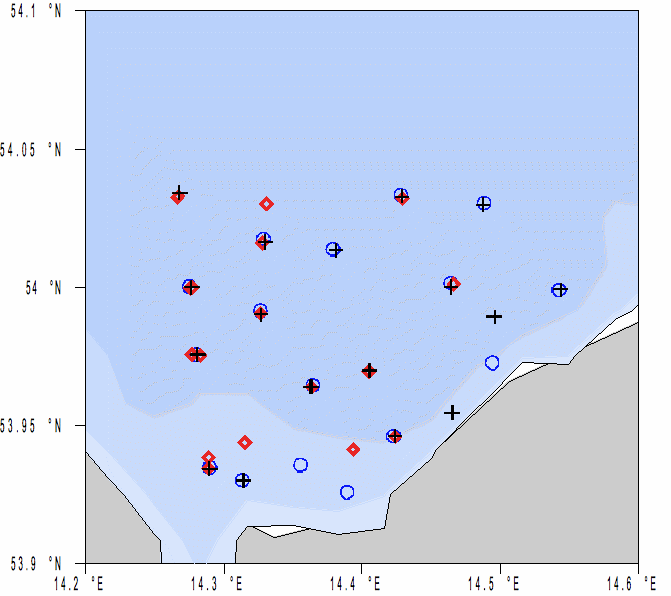 Figure 1: Station map of the Oder outflow. Crosses denote stations of transect 1, diamonds denote stations of transect 2 and circles denote stations of transect 3.