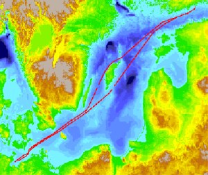 Die obere Abbildung zeigt die Verteilung des CO2-Partialdrucks (pCO2) zwischen der Mecklenburger Bucht und dem Finnischen Meerbusen im Winter (rot) und Frühjahr (grün) in 2008. Im Winter wird durch die tiefe Durchmischung CO2-reiches Wasser an die Oberfläche transportiert, so dass das Wasser durchgehend eine CO2-Übersättigung gegenüber der Atmosphäre (etwa 380 µatm) zeigt. Ausgelöst durchden CO2-Verbrauch während der Frühjahrsblüte sinkt der pCO2 im April kräftig und fällt im Nordosten der Ostsee auf Werte unter 100 µatm ab. Die daraus berechnete Biomasse-Produktion erfordert einen Stickstoffbedarf, der nur etwa zur Hälfte durch den winterlichen Nitratvorrat gedeckt wird. Es gibt deutlihce Hinweise darauf, dass dieses Defizit durch die Stickstofffixierung ausgefüllt wird.