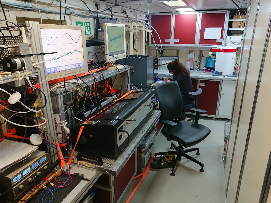 Die Arbeitsgruppe Marandino vom GEOMAR Institut für Ozeanforschung Kiel führt für die Bestimmung von k Eddy-Kovarianz Messungen durch. Diese Technik erfordert eine schnelle und präzise Messung des vertikalen Windes und der gleichzeitigen (ebenso schnellen und präzisen) Messung der Gaskonzentrationen, welche zur Bestimmung des Gasflusses mathematisch kovariiert werden. An Bord des Forschungsschiffes werden mit diesen Techniken die Gase CO2 und DMS untersucht. Windgestützte Messungen werden an einem eigenen Mast durchgeführt, welcher am Bug des Schiffes aufgestellt wurde und mit Inlets für CO2 und DMS ausgerüstet ist (Abb. 2). Die analytischen Instrumente sind durch Schläuche und Kabel mit dem Mast verbunden, so dass die analytische Auswertung in einem Labor unter Deck stattfindet (Abb. 3). Die Trennung der Messorte (Mast und Labor) und die Bewegung des Schiffes stellen uns vor schwierige Herausforderungen. Zusätzlich zu diesen Herausforderungen kommen noch ungünstige Windbedingungen (Windrichtung), gegeben durch die Verfolgung des Tracerpatches. Deshalb ist es vor allem bei den täglichen CTD Stationen von Vorteil, wenn das Schiff mit dem Mast in den Wind gerichtet ist. Für den Rest der Fahrt hoffen wir jedenfalls auf gute Winde.