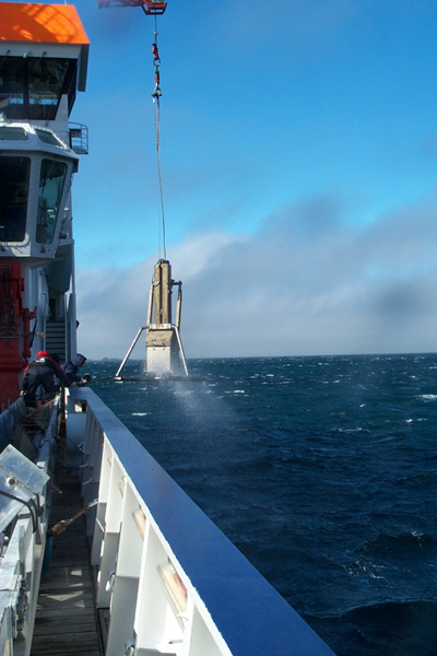 Auch der Boxcorer hat mit der Strömung zu kämpfen. Der Draht zeigt an, dass der Kastengreifer sich vom Ausgangspunkt entfernt hat.