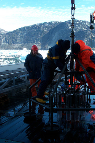 Im Chemielabor haben Nils Risgaard-Petersen und Sören Rysgaard vom Institut für natürliche Ressourcen in Nuuk ihre Messreihen aufgebaut. Sie messen mit empfindlichen Sensoren den Sauerstoffgehalt im Sediment. Sie untersuchen, wie Mikroorganismen das Sediment verändern (P0001917).