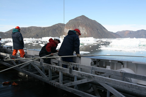 Bevor der Multicorer aus dem Wasser gehievt wird, müssen Thorsten Schoenbeck und Bernhard Prochnow mit langen Stangen die Eisbrocken, die hier allgegenwärtig sind, auf Abstand halten. Sie könnten den MUC sonst beschädigen.