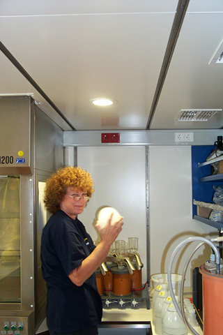 Erika Trost beim Frühsport: Bevor die Wasserproben, die Joanna Waniek mit der CTD-Sonde geholt hat, auf die Filter kommen, müssen sie kräftig durchgeschüttelt werden. Die Filter sollen im Wasser enthaltene feinste Partikel auffangen. Sowohl das Filtrat als auch die Filter werden mit nach Hause genommen. In den Wasserproben werden dort die Nährstoffe analysiert. Anhand des Filters wird der Gehalt an suspendiertem Material bestimmt.