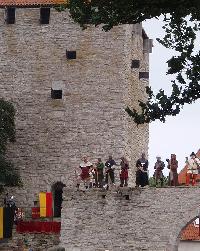 Vorerst aber können wir für wenige Stunden festen Boden unter den Füßen spüren. Erfreulicherweise finden wir die Stadt Visby, die mit seiner komplett erhaltenen Stadtmauer ohnehin wie aus vergangener Zeit stammend erscheint, auch noch am ersten Tag des Mittelalter-Festivals vor, was für die Landgänger eine willkommene Abwechslung zu unserer augenblicklichen HighTech-Umgebung darstellt. So ist die Stadt fest in der Hand von Rittern und anderen Mittelalterlichen Gestalten, teilweise bewaffnet mit Helm und Schild, Bögen, Äxten und Langschwertern.