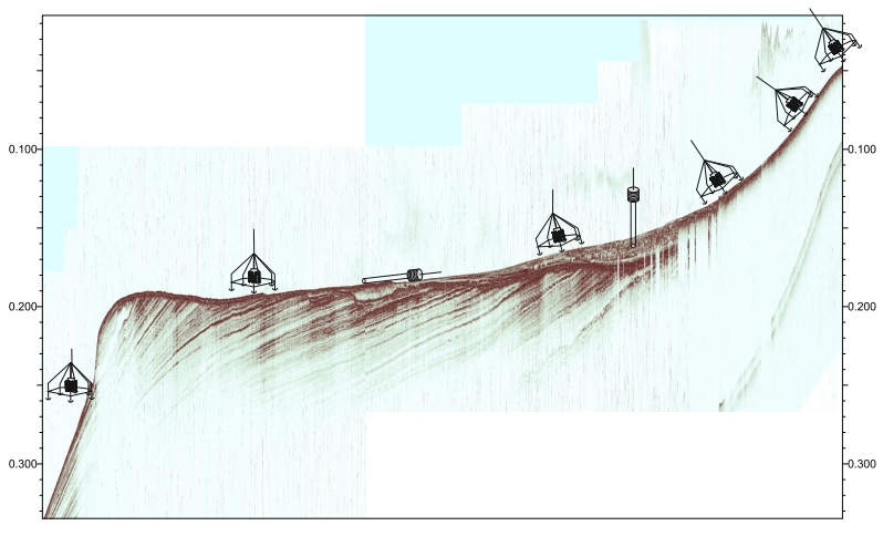 Wir fahren den Transekt, wie auch alle anderen vorangegangen, erstmal mit dem Scanfish und dem Parasound ab. Wie bereits in einem vorherigen Blog erwähnt, erhalten wir mittels Scanfish Informationen über das Mischungsverhältnis der unterschiedlichen Wassermassen, als auch über die vorherrschenden Sauerstoff-Bedingungen. Das Parasound hingegen wird von den Geologen eingesetzt. Mithilfe des Schiffs eigenen Parasound-Systems ist es möglich sich eine ungefähre Vorstellung der Beschaffenheit und Stratifizierung des Meeresbodens zu machen. Hierfür wird vom Schiff ein akustischer Impuls ausgesendet, der an verschiedene Grenzflächen (hauptsächlich dem Meeresboden) reflektiert wird. Diese reflektierten Signale und vor allem deren Laufzeiten werden aufgezeichnet. Das Parasound System läuft während das Schiff fährt. Dabei entstehen mehrere dieser Laufzeitmessungen entlang eines Profils. Letztendlich werden die Laufzeitmessungen dann aneinandergereiht, um ein Abbild des Untergrunds zu erstellen. Hierbei kann das Signal, abhängig von der Bodenbeschaffenheit, von einigen Metern bis mehreren Zehnermetern tief eindringen.