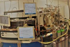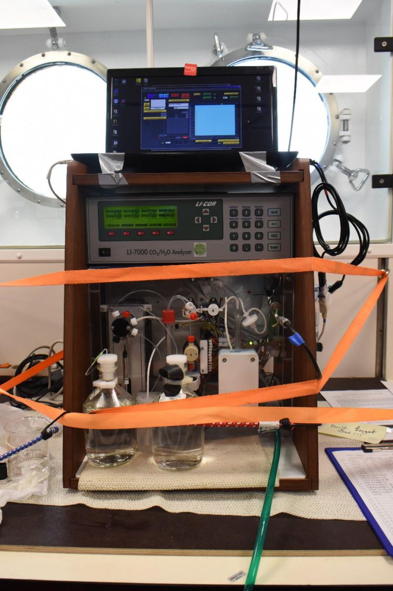Um die Gasdynamik auch in tieferen Wasserschichten zu untersuchen, nimmt Dr. Bita Sabbaghzadeh mithilfe der CTD Proben aus der Wassersäule - von der Oberfläche bis in die Tiefe - an den jeweiligen Stationen, die wir anfahren. Diese Wasserproben müssen immer vor allen anderen Proben abgefüllt werden, um keine Verunreinigungen durch andere Oberflächengase zu erhalten, was für die späteren Gasmessungen am IOW äußerst wichtig ist, um das zugrunde liegende Muster der Gase zu ermitteln. Um das Karbonatsystem im Auftriebssystem in den Griff zu bekommen, messen die Biogeochemiker auch den gelösten anorganischen Kohlenstoff (dissolved inorganic carbon; DIC) und den pH-Wert des Meerwassers, beides wichtige Parameter für das anorganische Kohlenstoffsystem. Der DIC wird dabei gleich an Bord mit dem sogenannten Automatischen-Infrarot-Anorganischem-Kohlenstoff-Analysator (Automated Infra-Red Inorganic Carbon Analyzer; AIRICA) gemessen.
