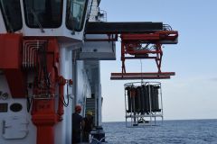 Nach ein paar Tagen steht nochmal ein Stopp an. Wir haben das Angolabecken erreicht und hier geht die letzte CTD ins Wasser. Zum einen werden hier nochmal physikalische Parameter gemessen und Geräte kalibriert, zum anderen kommen die letzten Spurengas- und Nährstoffproben an Bord. Nachdem die CTD wieder sicher an Deck steht und alle Proben genommen wurden, wird natürlich ein bisschen, bei nun tropischen Temperaturen, gefeiert.