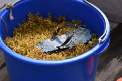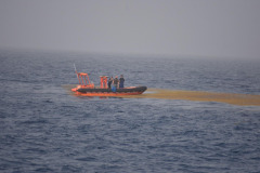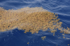 Am Abend darauf können wir auf der Wasseroberfläche Algenmatten erkennen – Sargassum sp.. Wir hatten gehofft, diese Algenmatten zu finden und so machen wir am nächsten Morgen einen kurzen Halt, lassen beide Schlauchbote ins Wasser und nehmen Proben. Sargassum, auch Golftang genannt, ist eine Gattung von Braunalgen, die weltweit in den wärmeren Meeren vorkommt. Das Sargassum, welches wir hier vorfinden, kommt aus der Sargassosee, einem Meeresgebiet im Atlantik östlich von Florida. Über die Meeresströmung wurden die Algenmatten bis hierher transportiert. Sie bieten vielen Lebewesen einen Unterschlupf und so wollten wir wenigstens ein paar Proben nehmen. Nachdem beide Schlauchboote und drei volle Eimer wieder an Bord sind, geht die Reise weiter.