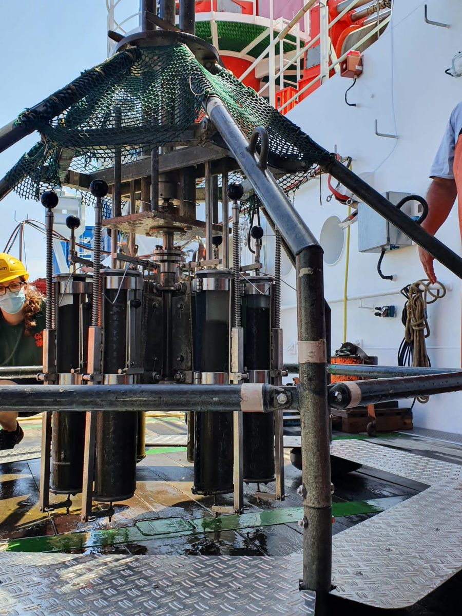 Der Van-Veen-Bodengreifer und der Multicorer (kurz: MUC) sind Geräte, mit denen Sediment vom Meeresboden gesammelt und an die Oberfläche transportiert werden kann. Der Van-Veen-Bodengreifer ist im Prinzip eine riesige Baggerschaufel, welche mittels Seils vom Schiff aus ins Wasser gelassen wird. Wenn der Bodengreifer den Meeresboden berührt, löst sich das gespannte Seil zwischen den Schaufeln, sodass diese sich schließen und dabei Sediment ausgraben. Nachdem der Greifer und sein Inhalt wieder an Bord gelangt sind, wir das Sediment über einem Sieb gewaschen. Größere bodenlebende Meerestiere, fachlich als Markrozoobenthos bezeichnet, bleiben im Sieb zurück und stehen so für weitere Analysen zur Verfügung. Bei dem sogenannten MUC wird hingegen eine definierte Sedimentoberfläche aus dem Meeresboden mittels Plexiglasrohren ausgestochen. Diese werden von uns dann entweder direkt beprobt oder das Material wird für weitere Experimente verwendet.