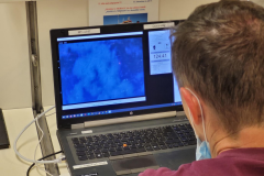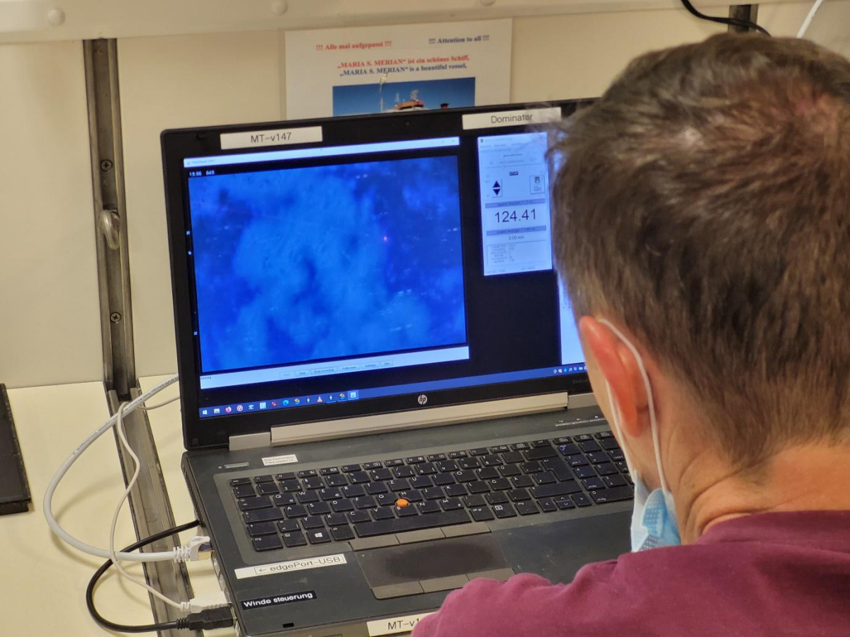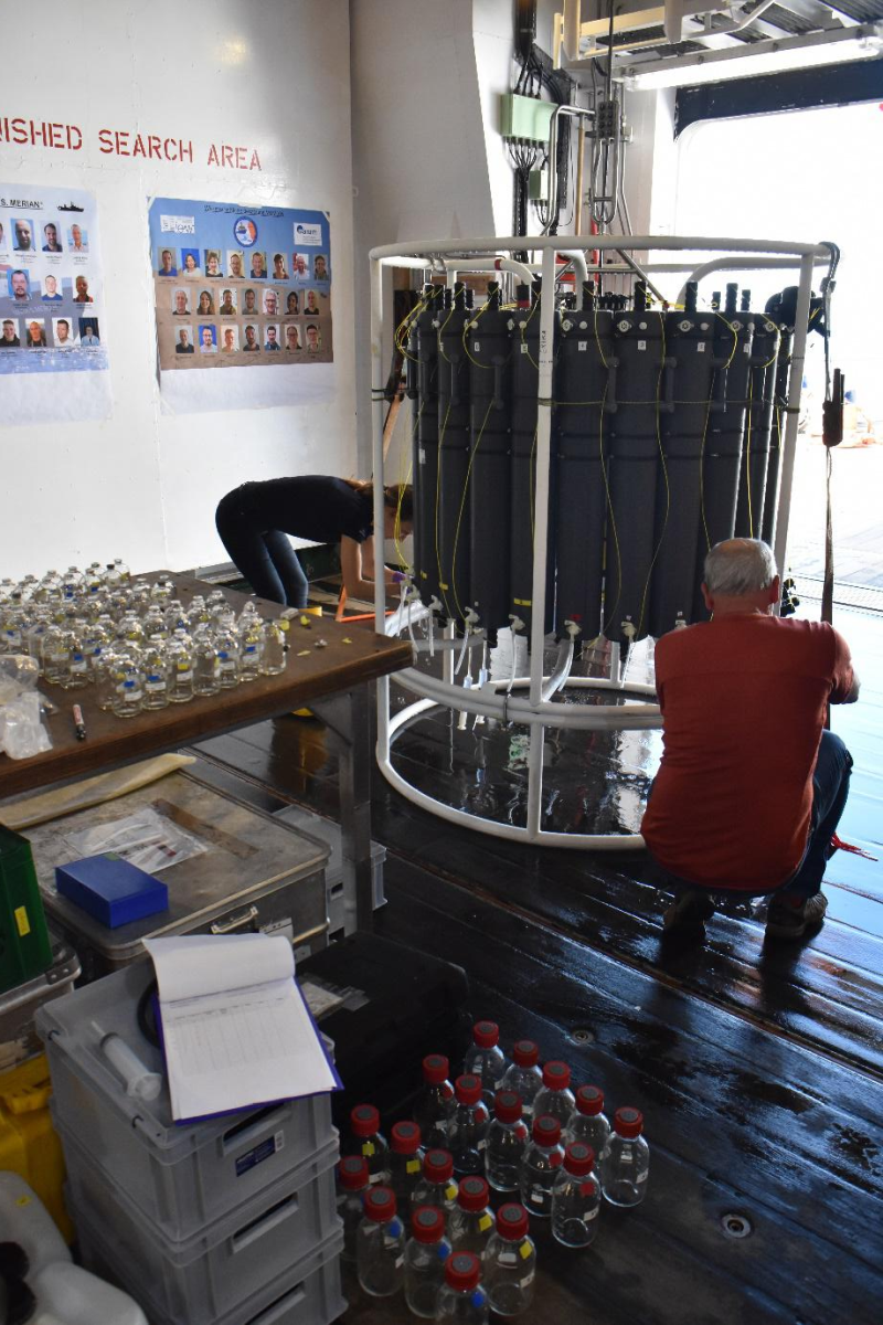 Neben den Makrozoobenthologen wollen auch die Mikrobiologen unter uns verstehen, wie unterschiedliche Organismen, in diesem Fall Bakterien und Archaeen, ihren Metabolismus unter Sauerstoffmangel verändern. Im Benguela-Auftriebssystem besitzen Mikroorganismen eine Schlüsselfunktion in verschiedenen biogeochemischen Prozessen, wie beispielsweise bei der Bildung der Spurengase Lachgas und Methan, sowie bei der Oxidation von Schwefelwasserstoff. Um einen besseren Einblick in die Funktionen der Mikroorganismen zu bekommen, untersuchen die Arbeitsgruppen Geomikrobiologie, geleitet von Prof. Dr. Heide Schulz-Vogt, und Mikrobielle Ökologie, geleitet von Prof. Dr. Klaus Jürgens, die Zusammensetzung und Aktivität der mikrobiellen Gemeinschaft in den sauerstoffarmen bzw. -freien Schichten der Wassersäule. Ein weiterer Fokus sind saisonale Unterschiede der Bakteriengemeinschaften. Hierzu werden wieder Stationen, welche bereits während der Winterausfahrt M157 mit dem FS „Meteor“ im Jahr 2019 angefahren wurden, beprobt. Es wird dabei zwischen freilebenden und partikelgebundenen Bakterien unterschieden, welche über Größenfraktionierung voneinander getrennt werden. Für die Untersuchungen funktioneller Gene und der Erfassung des gesamten bakteriellen Genpools, werden Wasserproben mittels modifizierter Wasserschöpfer an der CTD, dem sogenannten AFIS (Automatic Flow Injection Sampler) System, direkt bei der Probenahme in situ fixiert.