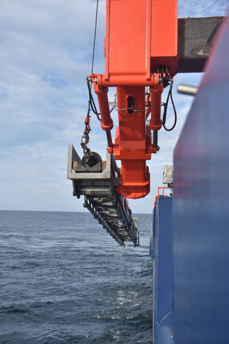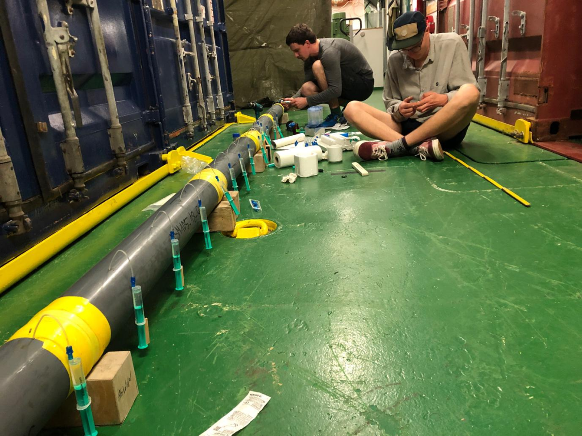 So richtig ans Werk ging es nun auch für die Geologen unter uns. Das Schwerelot, auch Gravitiy Corer genannt, kam endlich zum Einsatz. Hierbei handelt es sich um ein langes Stahlrohr, dass über eine spezielle Absetzvorrichtung ins Wasser gelassen wird und auf den Meeresboden absinkt. Am oberen Ende dieses Rohres ist ein 1,5-t-schweres Gewicht angebracht, so dass sich das Rohr beim Auftreffen auf Grund bis zu 10 m sich in den Meeresboden gräbt. Der so gewonnene Bohrkern wird dann an Bord geholt und von dem Geologen Michael Kossack und seinen beiden studentischen Hilfskräften untersucht und für weitere Analysen beprobt. In seiner Doktorarbeit untersucht Michael anhand der Sedimentkerne aus Schwerelot und MUC, wie sich die Sauerstoffkonzentration im Bodenwasser über dem flachen Kontinentalschelf seit der letzten Eiszeit entwickelt hat. Dabei nutzt er das Umweltverhalten von Spurenmetallen wie Uran und Molybdän die je nach Sauerstoffgehalt in unterschiedlichen Mengen im Sediment vorkommen.
