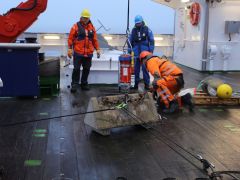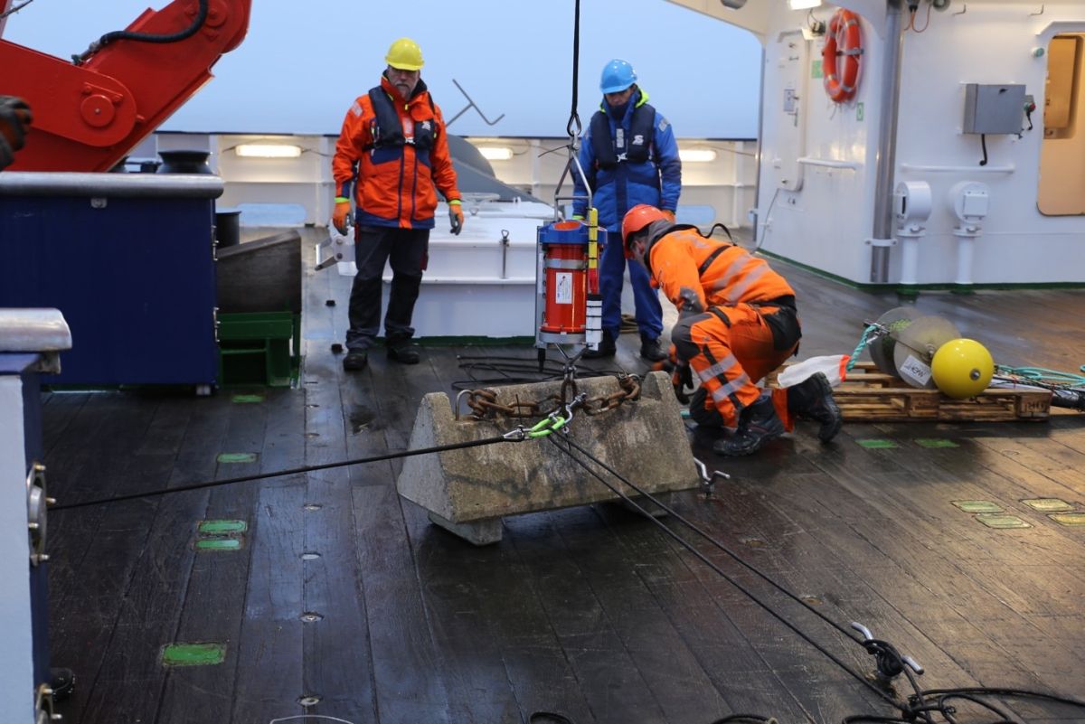 In der Bottensee bringen Toralf und Volker eine so genannte Verankerung oder mooring aus. An der Position, die sie dafür ausgewählt haben, ist die Ostsee circa 220 m tief. Das Herzstück ist ein Strömungsmesser, ADCP genannt, der mit einem schweren Betonklotz verbunden und damit kurz vor dem Meeresboden verankert wird. Von hier aus kann er bis zu 30 m hoch in dem Wasser über sich Strömungsgeschwindigkeit und -richtung messen. Ausgestattet ist er mit Sonden, die zusätzlich Salzgehalt, Temperatur und Sauerstoff messen und zahlreichen Auftriebskörpern, die die Konstruktion im Wasser aufrecht halten. Insgesamt ist das Kabel, an dem Geräte und Auftriebskörper angebracht sind, über 40 m lang. Diese Geräte-Kombi wird ab heute für rund ein Jahr vollautomatisch im Dauerbetrieb arbeiten und die dabei gewonnenen Messdaten speichern – in über 200m Wassertiefe!