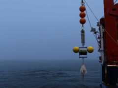 Und dann wird sie über den A-Rahmen vom Achterdeck ins Wasser gelassen – unsere kleine Dauer-Messstation. Bis zum nächsten Jahr!