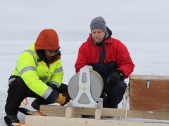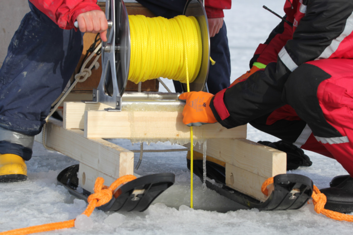Nach einer 2 Stunden-Schicht bei gefühlten -10° ist es gut, wenn eine engagierte Ablösung bereit steht und nach 8 Stunden wird es dann auch für das Material kritisch. Das Datenkabel, über das die Übertragung von der Sonde funktioniert, aber auch die Winde, mit der die Sonde jeweils hochgezogen wird, zeigen erste Ausfallerscheinungen. Es wird Zeit für heute Schluss zu machen.