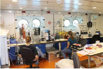 Am 02 November 2013 um 8:00 Uhr morgens lief FS Maria S. Merian aus Cadiz, Spanien aus um nach einem etwa 8-tätigen Transit durch das Mittelmeer das Hauptarbeitsgebiet der Reise MSM33 im nördlichen Schwarzen Meer zu erreichen. Nach Passieren der Straße von Gibraltar wurde von der 14-köpfigen Wissenschaftscrew des Leibniz-Institutes für Ostseeforschung Warnemünde bei sommerlichen Temperaturen die wissenschaftliche Arbeit aufgenommen. Diese bestand zum Einen aus der kontinuierlichen Beprobung des Oberflächenwassers entlang der ~1500 Meilen langen Transitstrecke. Neben der Untersuchung der Ozean-Atmosphäre-Austauschprozesse natürlicher volatiler halogenierter organischer Kohlenstoffverbindungen und des Vorkommens organischer Schadstoffe im Meerwasser (9 Intervallbeprobungen) wurden an 17 Stationen das Meerwasser auf seine Gehalte an Nährstoffen und partikulärem Material untersucht, die später um mikrobiologische Analysen und Bestimmungen der stabile Isotopenzusammensetztung (O, H, C, S) ergänzt werden. Insgesamt wurden die für diese Jahreszeit charakteristischen oligothrophen Verhältnisse angetroffen. Bereits während der FS Meteor-Fahrt M84 im Frühjahr 2011 konnten Transekt-Daten dieser Art gewonnen werden und ermöglichen nun einen saisonalen Vergleich. Zweiter Schwerpunkt der Bordarbeiten war die Installation und Erprobung der Messsysteme (u.a. CTD und Pump-CTD), die später im Schwarzen Meer zum Einsatz kommen werden.