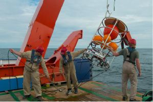 Zurück zum Geschehen östlich Gotlands, nahe der Station TF 271, einige Tage später: Nach der Bergung des Drifters am 18ten Juli stand für den Nachmittag des 19ten Juli die Bergung der GODESS Verankerung und der Sinkstofffallenverankerung an. Zuvor war die Nacht und der Vormittag für weitere Arbeiten an unserer Hauptstation genutzt worden. Dabei ist insbesondere der erfolgreiche Einsatz eines neu entwickelten Nährstoffprobensamplers in Verbindung mit der Pump-CTD zu erwähnen, mit dem in kurzer Zeit ein Profil der Nährstoffverteilung der oberen 40 m der Wassersäule mit einer Auflösung von 1 m gesammelt wurde. Eine solche vertikale Auflösung ist mit der sonst eingesetzten System aus CTD und Kranzwasserschöpfer sowohl aufgrund der verfügbaren Schöpferzahl wie auch aufgrund der Limitierung durch Verschleppung und die vertikale Dimension des Geräts schlicht nicht möglich. Bei dem hierauf folgenden Versuch die GODESS-Verankerung zu bergen zeigte sich dann aber, dass die Geräte trotz positiven Signals durch den Releaser nicht an die Oberfläche kamen. Nach mehreren Versuchen wurde daher zunächst die Sinkstofffallenverankerung ausgelöst und sicher geborgen. Nach erneut fruchtlosem Versuch, die GODESS-Verankerung durch Auslösen des Releasers an die Oberfläche zu bringen, wurde der Versuch der Bergung vorerst aufgegeben, die Nacht für abschließende Arbeiten an der Station TF 271 und ein letztes Oberflächennetz in der Nacht genutzt, um pünktlich um 6 Uhr am Morgen des 20sten Juli, unseres letzten Arbeitstages, die GODESS-Verankerung durch „Igeln“ der Bodenleine zu bergen. Dieses Unterfangen gelang, durch sorgfältige Vorbereitung und Durchführung aller Beteiligten auf Brücke und an Deck, schließlich im dritten Anlauf, so dass nach knapp fünf Stunden auch die GODESS-Verankerung sicher und unversehrt an Bord stand.