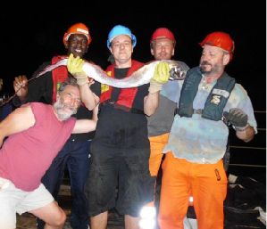 Neben dem Plankton gehen ab und an auch unerwartete Tiere ins Netz, wie dieser Riemenfisch (linkes Bild). Die Fässer für das Mischungsexperiment werden regelmäßig kontrolliert und beprobt (rechtes Bild).