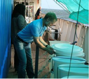 Eine wesentliche Eigenschaft eines Auftriebsfilaments ist die Front zwischen kaltem Auftriebswasser zum umgebenden ozeanischen Wasser. Gerade in diesen Frontbereichen sollte es zu einer höheren Vielfalt der Planktongemeinschaft und intensivierten biogeochemischen Umsätzen kommen. Die Prozesse, die sich in dieser Durchmischungszone abspielen, sind aber schwer direkt im Ozean zu fassen, da diese Zonen ihre Lage beständig verändern und kaum langfristiger zu verfolgen sind. Deshalb werden auch an Bord Experimente durchgeführt, die die Bedingungen im Ozean nachbilden. Die Reaktion des Phytoplanktons auf die Vermischung der beiden Wasserkörper in der Front des Filaments wird beispielsweise in einem Mischungsversuch beobachtet. Dazu wurden jeweils mehrere 100 Liter Fässer mit Wasser außerhalb und innerhalb des Filaments gefüllt. In einem weiteren Satz von 3 Fässern wurden die beiden Wasserkörper 1:1 gemischt. Die Entwicklung in den Fässern, die auch als Mesokosmen bezeichnet werden, verfolgen wir seit dem 25. Januar. Schon rein visuell entwickeln sich die drei Ansätze unterschiedlich. Die außerhalb des Filaments gefüllten Fässer blieben im Wesentlichen klar, während die innerhalb des Filaments gefüllten Fässer schnell trübe wurden, was auf starkes Phytoplanktonwachstum hinweist. Auch das Mischwasser zeigte schnell eine Eintrübung, was als Zeichen für einen starken Wachstumsimpuls interpretiert werden kann. Nachdem die zu Beginn des Experimentes vorhandenen Nährstoffe verbraucht sind, stagniert das Wachstum jetzt und das Wasser wird wieder klarer. In regelmäßigen Abständen werden Proben aus den Fässern genommen, um später eine detaillierte Auswertung der Phytoplankton- und Zooplanktonaktivität zu ermöglichen.
