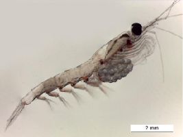 Das enge Stationsraster, das über das Filament gelegt wurde, ergab auch die einmalige Gelegenheit, Horizontal- und Vertikalverteilung der Krillarten im Gebiet genau zu dokumentieren. Diese Leuchtgarnelen (Euphausiiden) werden im Zooplankton als Schlüsselorganismen im Nahrungsnetz eingehend untersucht. Wir fanden eine klare Zonierung von der Küste mit Nyctiphanes capensis (Abb. rechts), über dem Schelfhang, den häufigsten Krill, Euphausia hanseni, der sich anschließend mit dem räuberischen Nematoscelis megalops (der „Großäugige“) mischt. Beide Arten sind darauf spezialisiert, sich tagsüber tief in der Sauerstoffmangel-Zone zu „verstecken“. Nachts steigt E. hanseni dann an die Oberfläche auf, um im Phytoplankton zu grasen. Im Filament stellen die Tiere aber ihre Vertikal-Wanderungs-Amplitude auf die maximale Tiefe des Filaments ein, um mitten in der reichen Nahrungszone verweilen zu können. Als wir dann küstenfern das nahrungsarme ozeanische Wasser erreicht hatten, zeigte dies die daran angepasste Form Euphausia recurva an. Wir haben es also mit Wassermassen-Indikatoren zu tun. Bemerkenswert ist, dass E. hanseni aber auch im nahrungsreichen Filament aktiv verbleiben kann: das Tier gehört deshalb eigentlich nicht mehr zum Plankton (dem passiv treibenden) sondern zum Mikro-Nekton, d.h. zu den aktiv und zielgerichtet schwimmenden Tieren.
