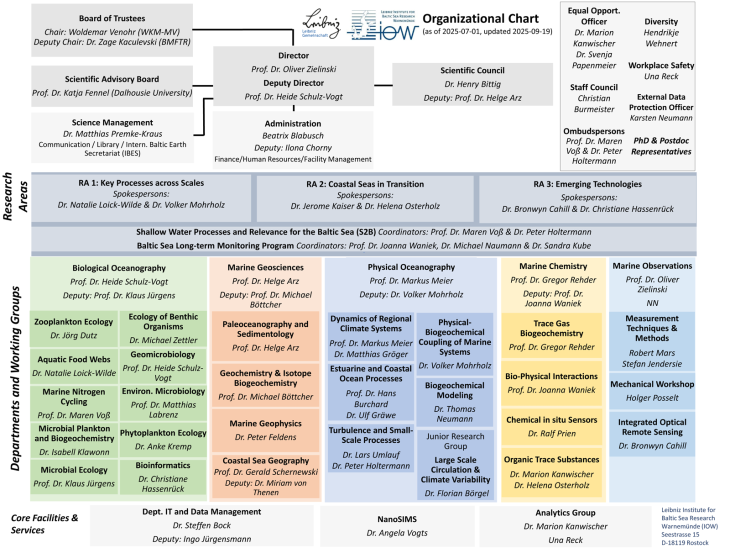 The Leibniz Institute for Baltic Sea Research Warnemünde (IOW) is a non-university institute that covers all core disciplines of marine research. Its research programme is directed towards coastal and marginal seas with a special focus on the Baltic Sea ecosystem. In addition to its research activities, the IOW pursues a transfer concept and operates research infrastructures for the scientific community. The IOW is a member of the Leibniz Association. Its institutional budget is jointly funded by the Federal Government and the Länder. The IOW is a foundation under public law.