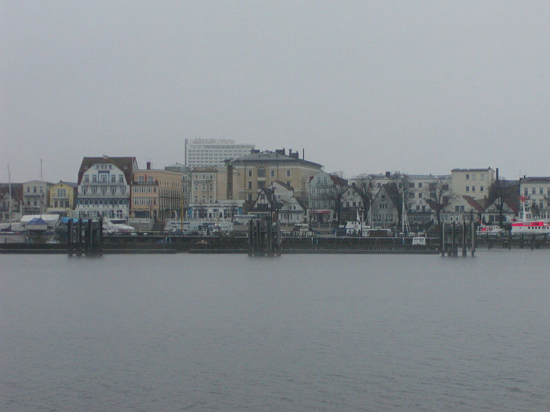 Warnemünde, 27.03.06, 10:14 Uhr - Auslaufen im Nebel. Blick auf den Alten Strom und Hotel Neptun.