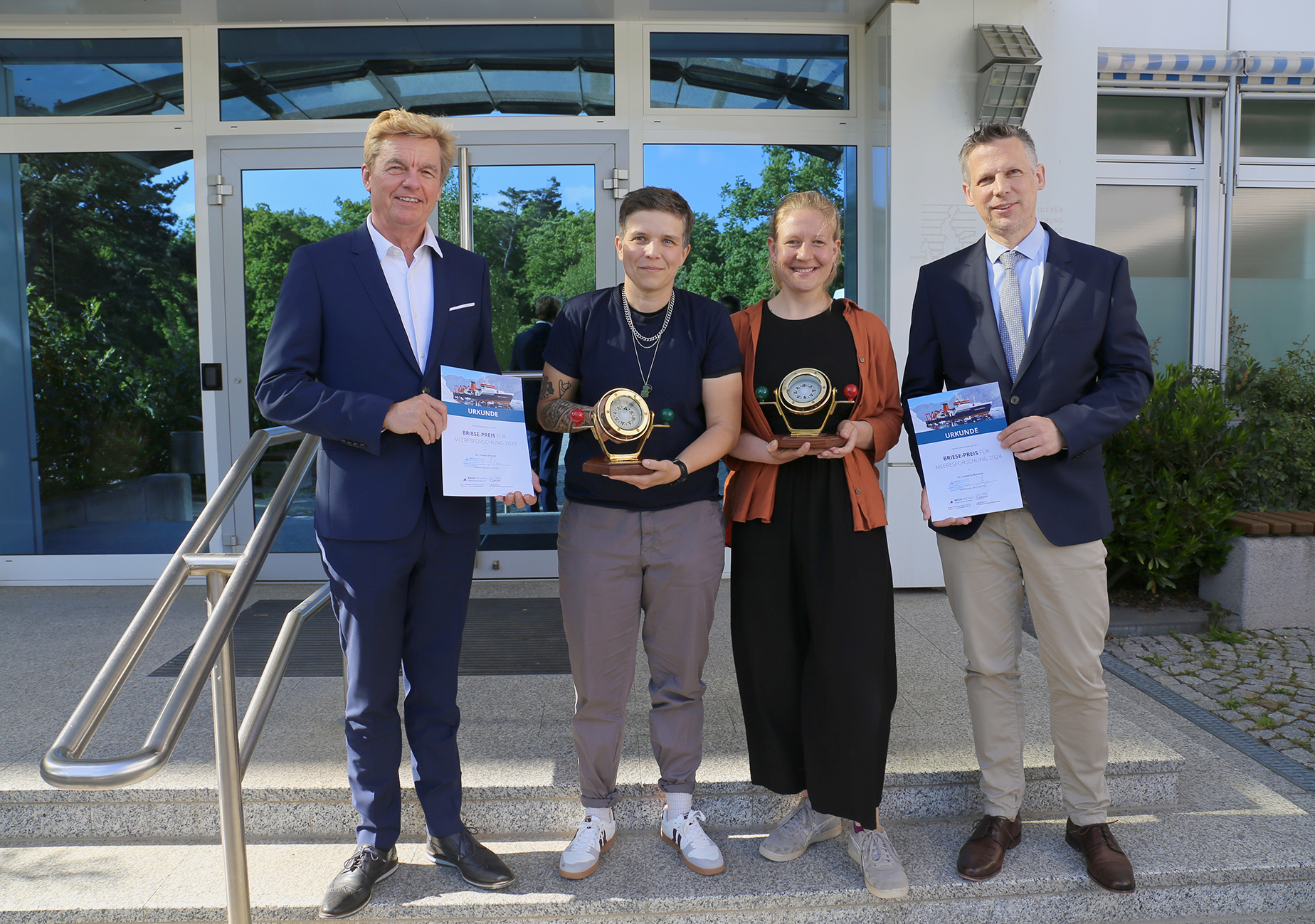 Die diesjährigen BRIESE-Preistragenden Tonke Strack und Isabel Goßmann (Mitte) mit Klaus Küper (l.), Leiter der BRIESE Research Forschungsschifffahrt, und IOW-Direktor Oliver Zielinski (r.) (Foto: IOW / K. Beck)