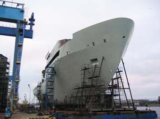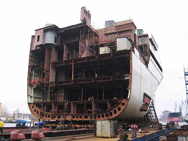 Ansicht beider Hälften (noch nicht zusammengeschweißt) auf dem Ponton von Steuerbord vorne