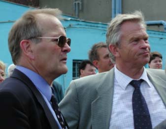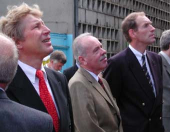 ...aufmerksam verfolgt von dem Vertreter des Auftraggebers (Herrn Ministerialdirigent H. Fischer, stellvertretender Staatssekretär, Ministerium für Bildung, Forschung und Kultur, Mecklenburg-Vorpommern), des BMBF (Herrn Konsul R. Wagner, stellvertretender Generalkonsul der BRD in Gdansk) und des Auftragnehmers (Herrn Herr Dipl.-Ing. H. Kahl, Geschäftsführer Kröger Werft) (von links)...