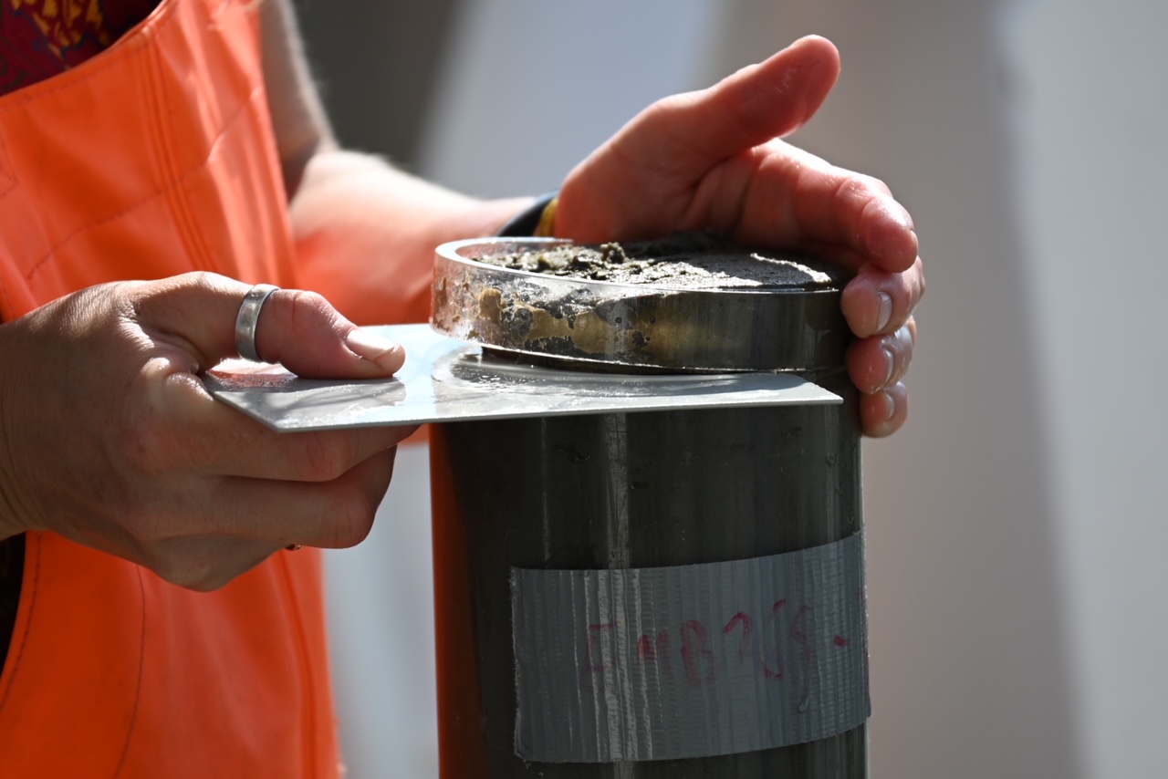 Impressionen der Arbeit an Bord: Beprobung von Sediment und Wasser und Fahrtleiter P. Feldens in Aktion