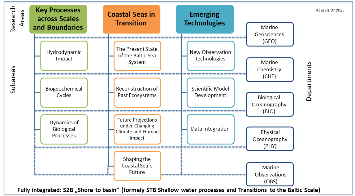 Our new research programme is structured along three research areas (see Figure 1 ), addressing open questions in “Key Processes across Scales” (Research Area 1), “Coastal Seas in Transition – Present, Past and Future Perspectives” (Research Area 2) and “Emerging Technologies” (Research Area 3). An important new step compared to the previous programme is its additional orientation towards the shallow water processes between the coastline and a water depth of about 10-20 m. All the scientific and technical staff involved in developing the measurement strategies and technological equipment needed for coastal ocean observation are bundled in the research unit “Marine Observations” (OBS). The overall structure of the IOW 10-year Research Programme will follow the well-established matrix approach, where all departments and the new organisational unit OBS contribute to the three Research Areas. As a new tool to address specific topics in an agile way and on shorter timescales, we are introducing the so-called Baltic Challenges. They bundle research activities within the three research areas that are suitable for making progress on specific emerging topics of interest for the Baltic Sea.